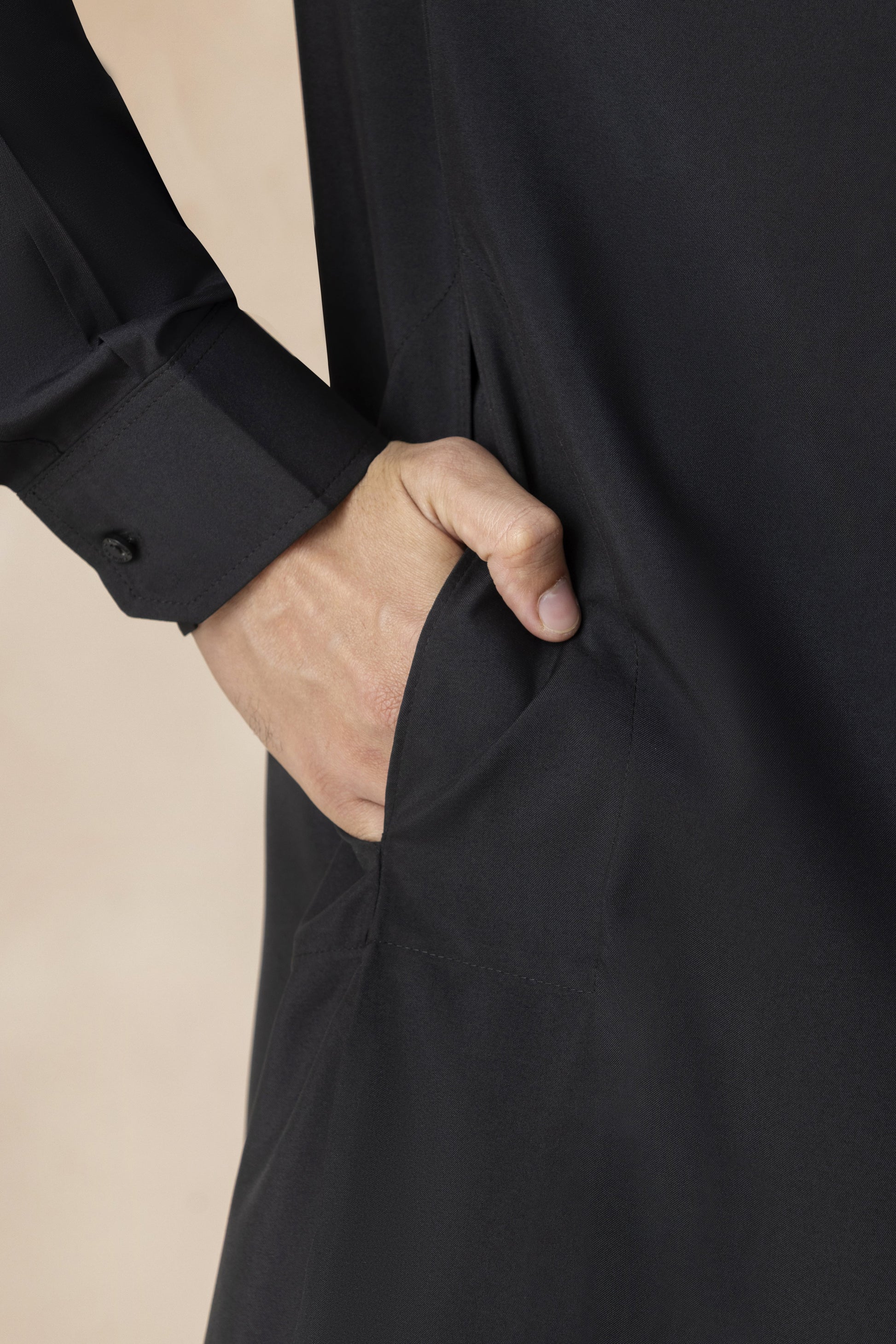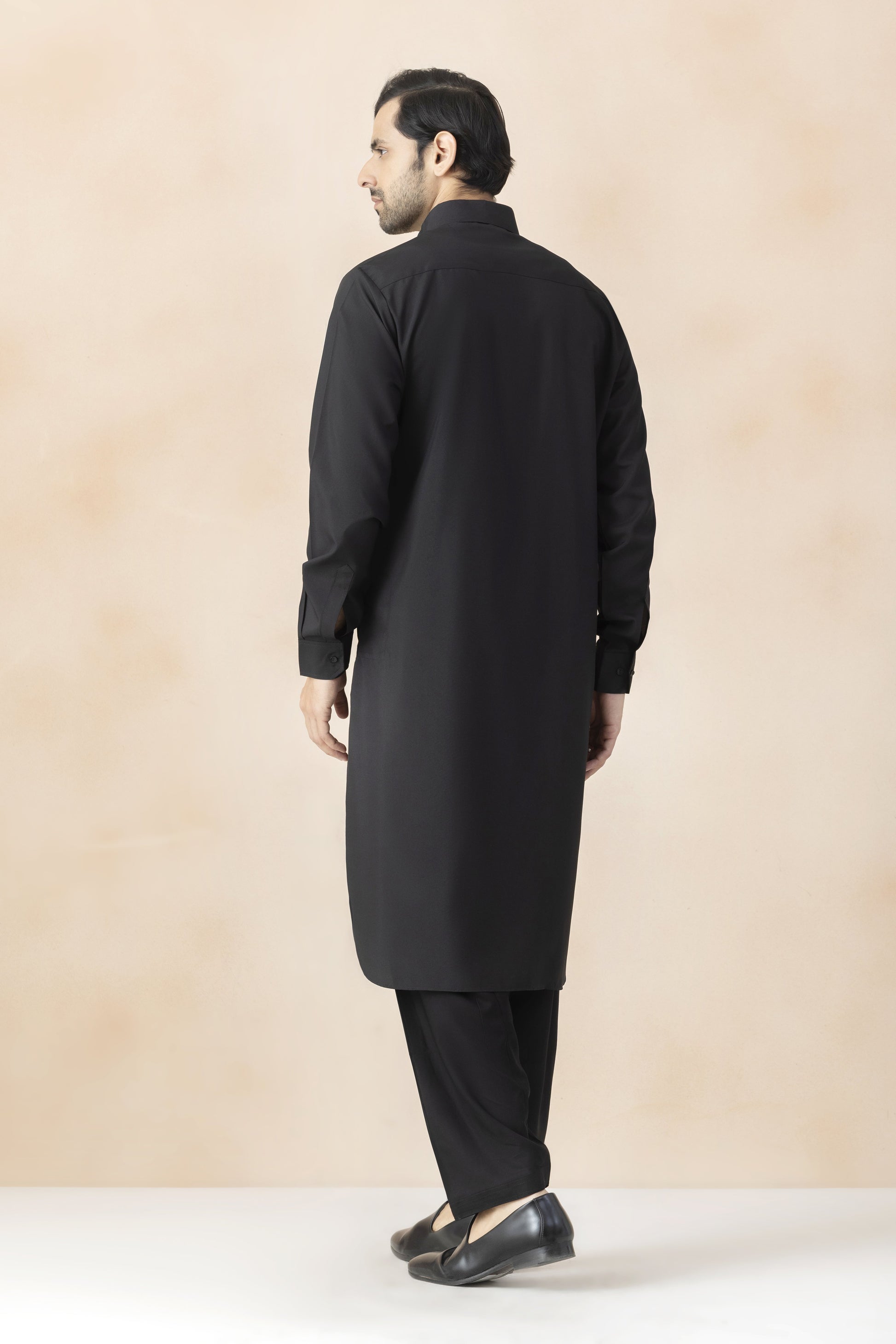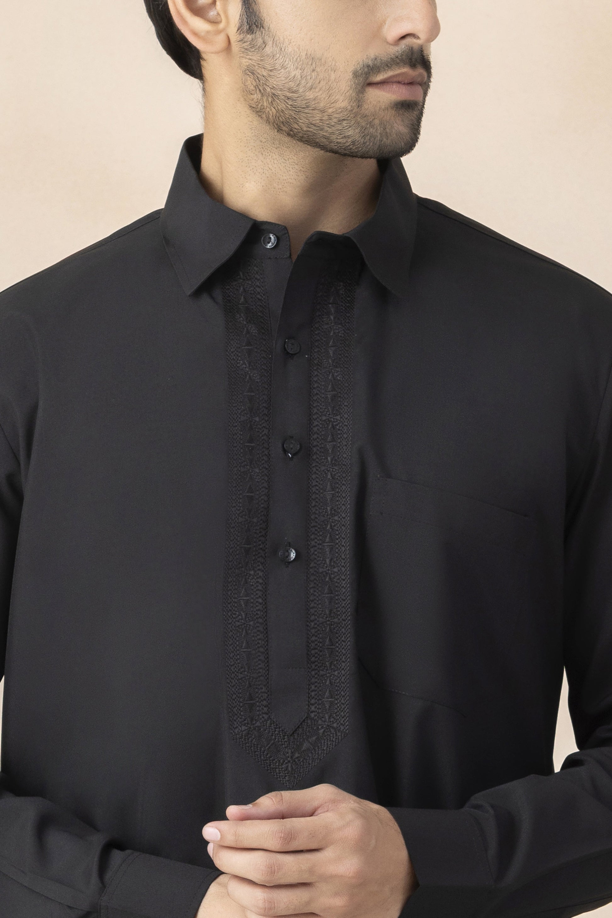 A classic men’s Pathani rendered in black, crafted in a smooth, fluid fabric that lends a refined and structured drape. The design features a clean shirt-style collar and a straight, elongated silhouette that stays true to traditional Pathani aesthetics while feeling contemporary. The front placket is elevated with understated tone-on-tone geometric embroidery, adding depth and quiet detailing without overpowering the minimal look. Full-length sleeves with clean cuffs and a neatly finished hem enhance the sharp, polished appeal. Timeless, versatile, and elegant, this Pathani is ideal for evening occasions, formal gatherings, festive events, and understated ceremonial wear.