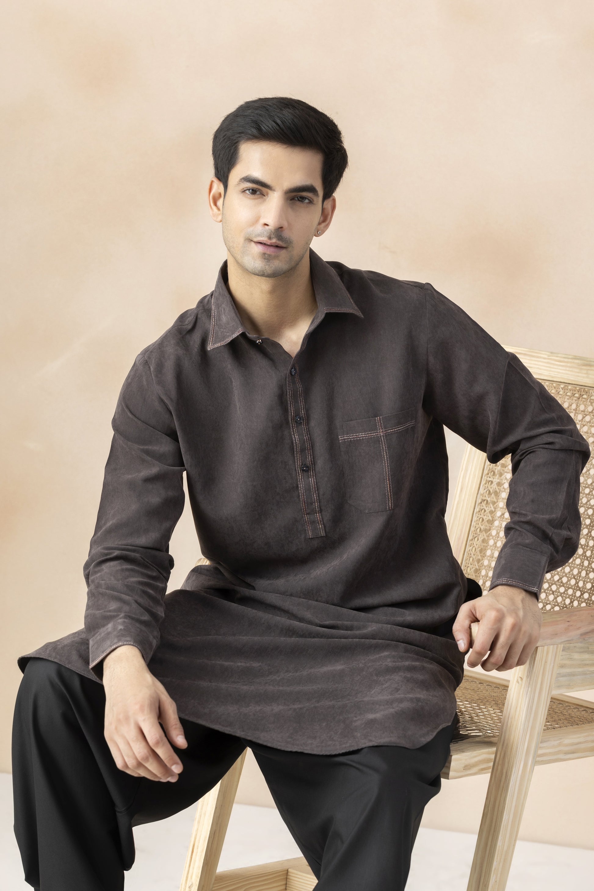 This men’s pathani is crafted in a rich charcoal-grey fabric featuring a soft, garment-dyed finish that gives it a refined yet contemporary character. Designed with a classic shirt collar, the kurta balances traditional silhouettes with modern tailoring. The front placket and chest pocket are highlighted with clean contrast topstitching, adding understated visual interest without overpowering the look. The straight, relaxed silhouette ensures comfort while maintaining a sharp appearance, making it versatile for both casual and semi-formal wear. Ideal for evening gatherings, festive dinners, cultural events, or elevated everyday styling, this kurta offers a timeless appeal with a modern edge.