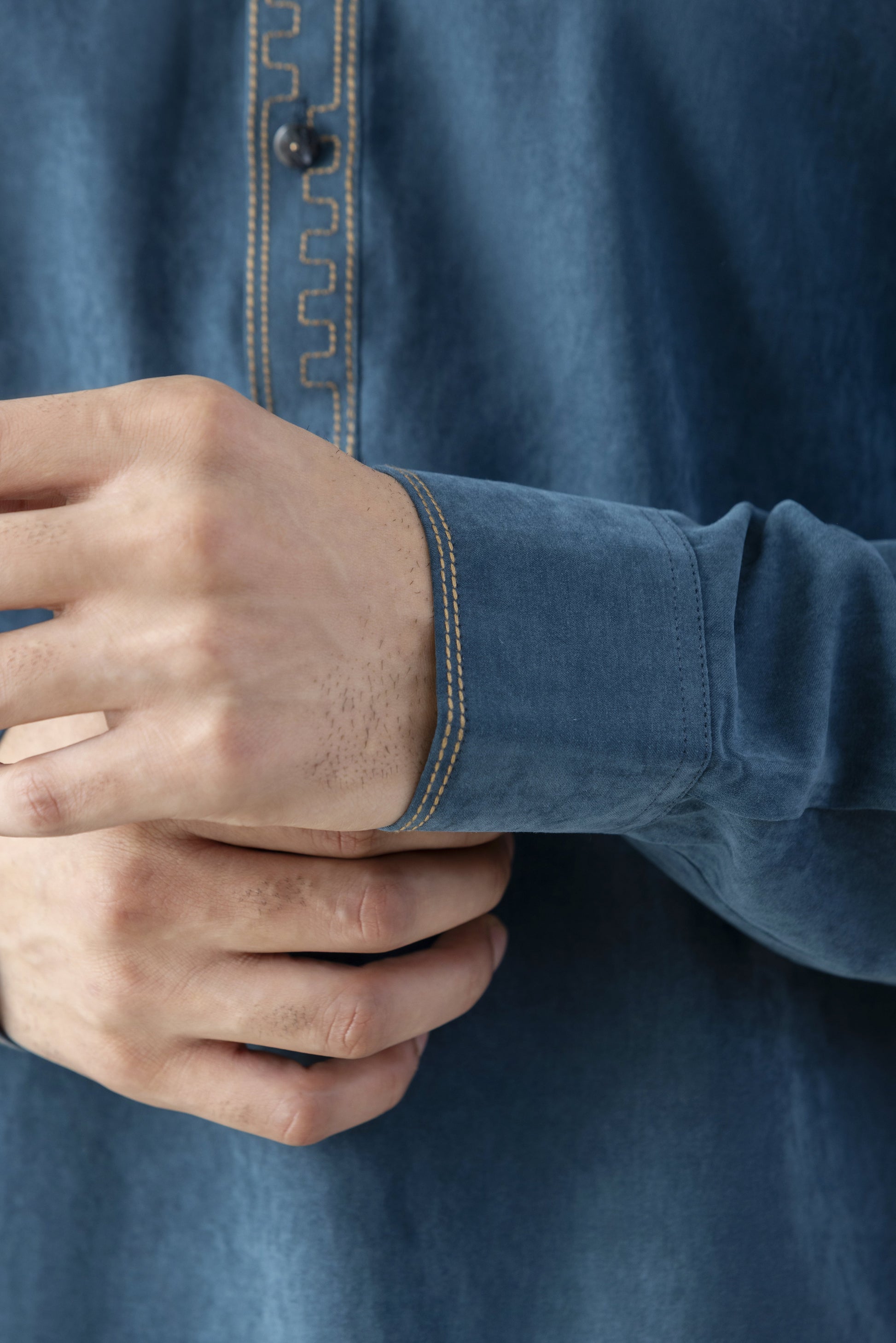 This men’s pathani is crafted in a rich teal-blue fabric featuring a soft, washed texture that adds depth and character to the surface. Designed with a classic shirt-style collar and a straight, relaxed silhouette, it balances traditional sensibility with a contemporary edge. The front placket is highlighted with neat contrast stitch embroidery, extending subtly along the collar edges to create a refined focal detail without overpowering the design. Full-length sleeves and clean finishing enhance its structured yet comfortable appeal. The overall look is understated, versatile, and polished perfect for festive gatherings, cultural occasions, and elevated everyday wear.