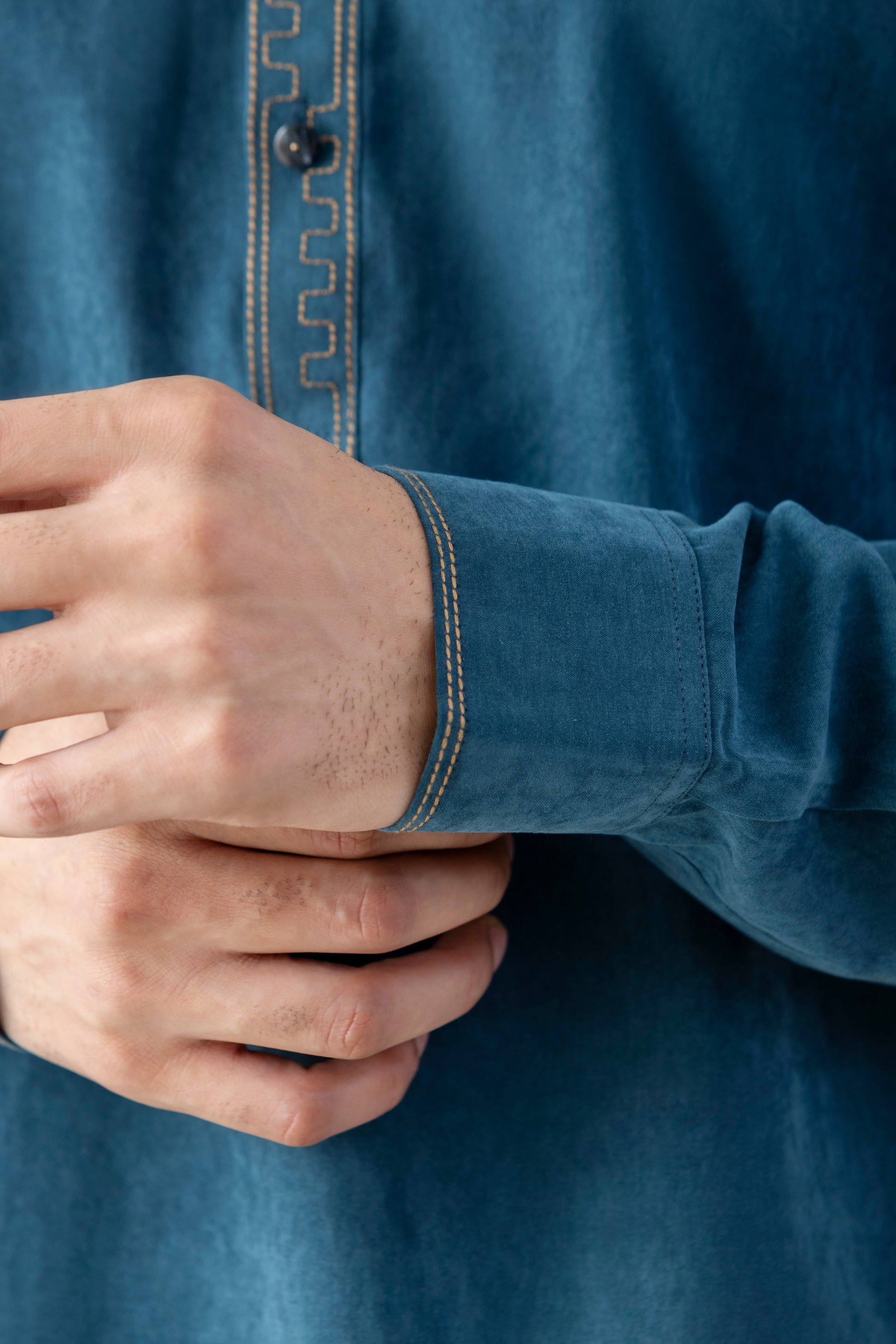 This men’s pathani is crafted in a rich teal-blue fabric featuring a soft, washed texture that adds depth and character to the surface. Designed with a classic shirt-style collar and a straight, relaxed silhouette, it balances traditional sensibility with a contemporary edge. The front placket is highlighted with neat contrast stitch embroidery, extending subtly along the collar edges to create a refined focal detail without overpowering the design. Full-length sleeves and clean finishing enhance its structured yet comfortable appeal. The overall look is understated, versatile, and polished perfect for festive gatherings, cultural occasions, and elevated everyday wear.