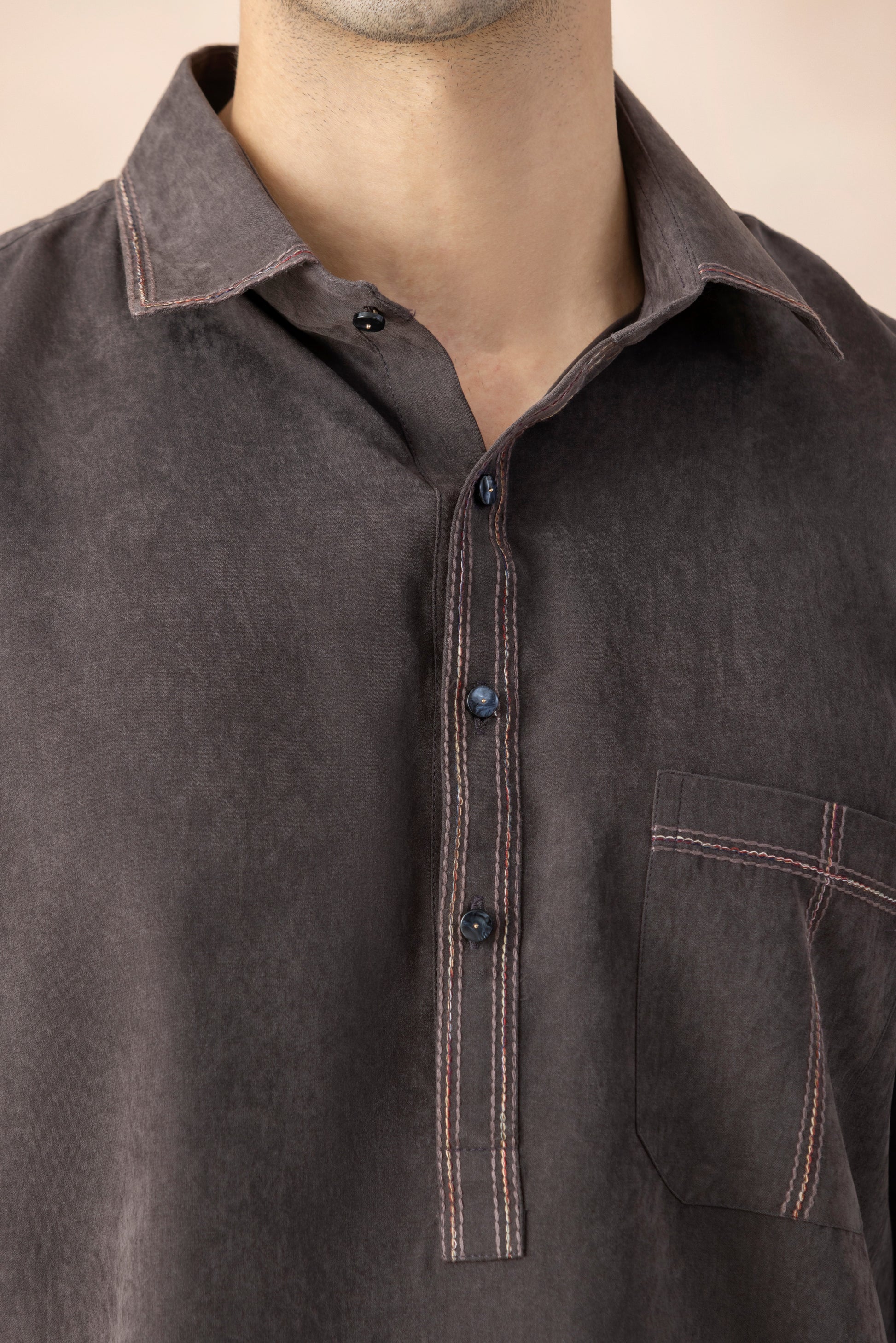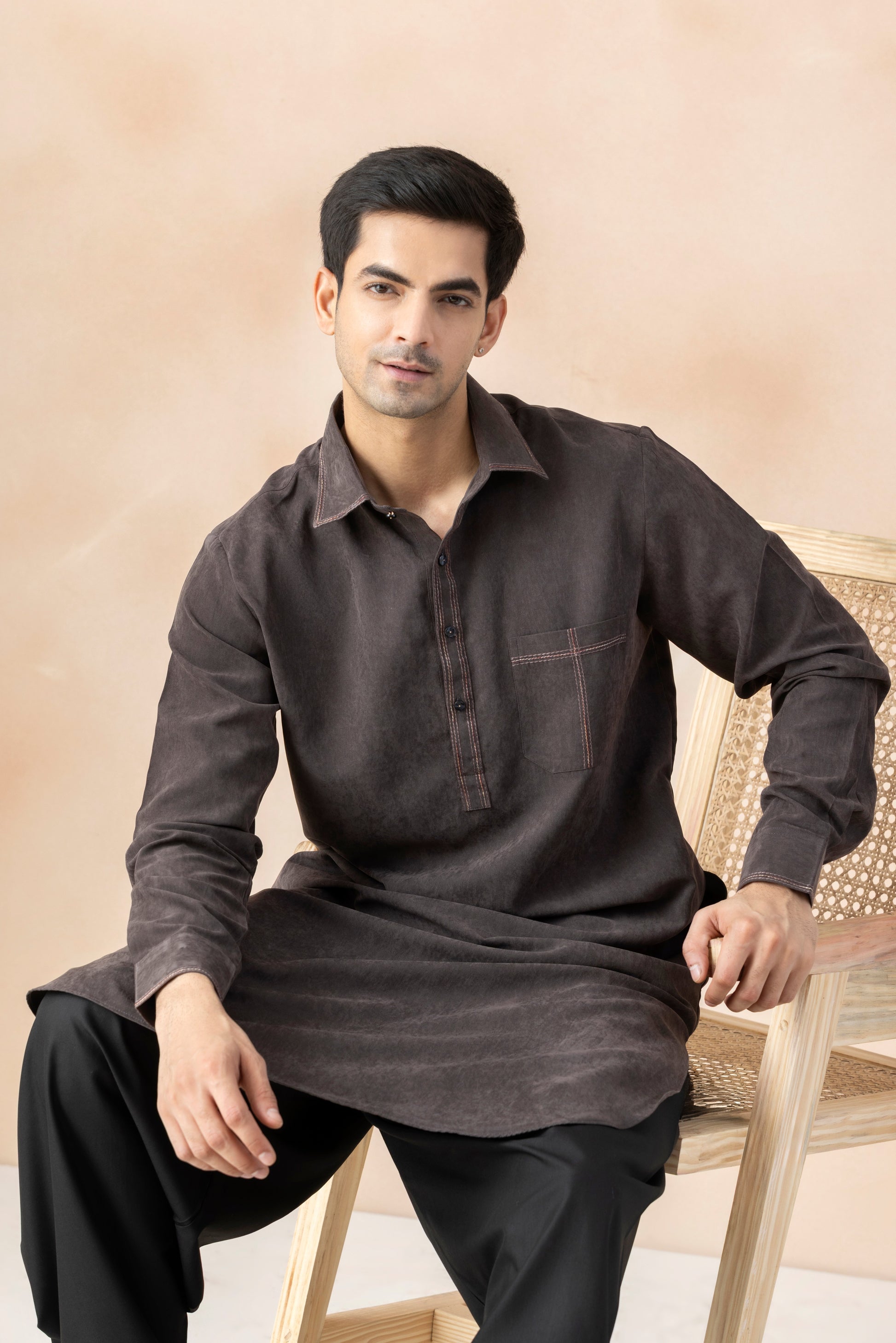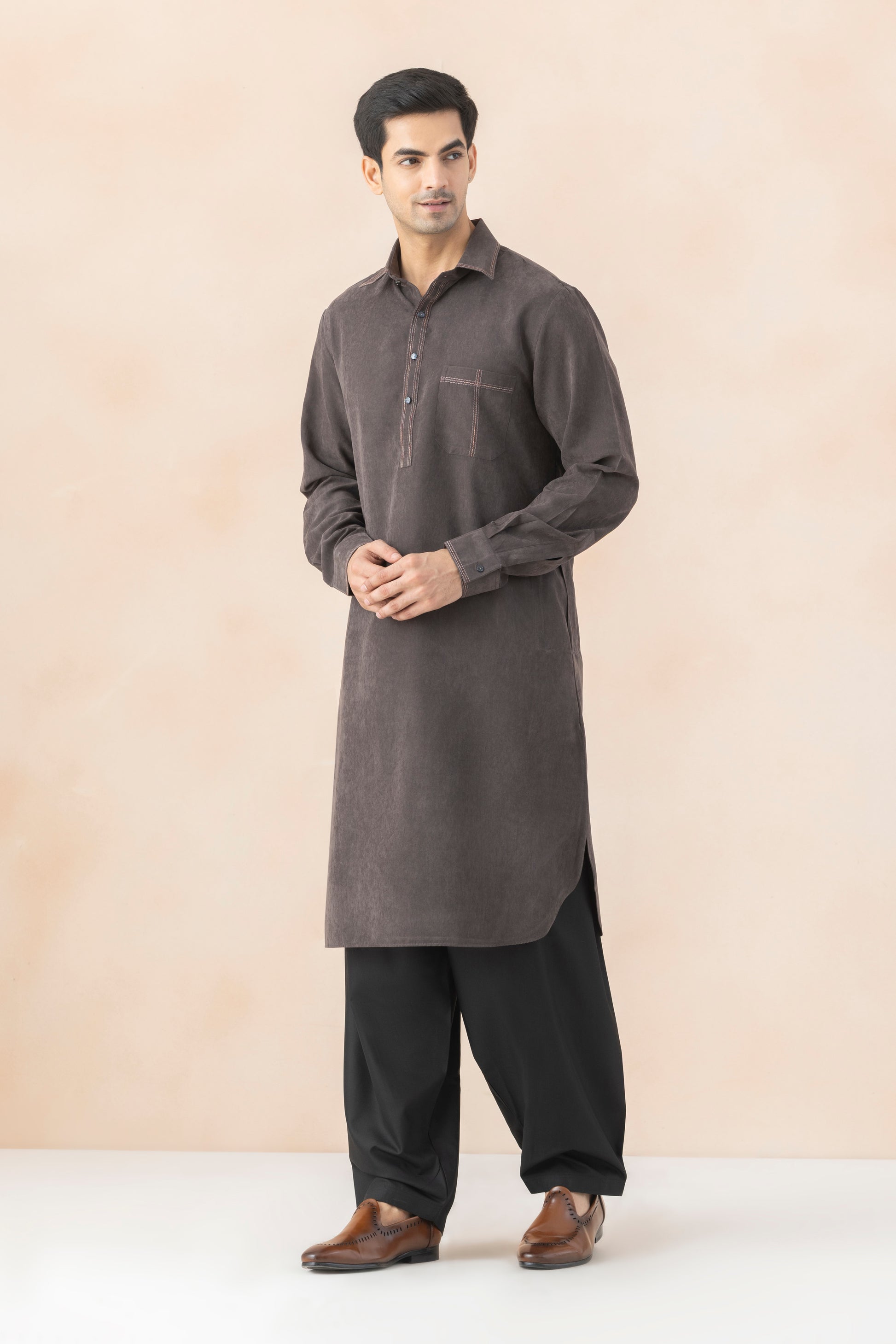 Crafted from cotton suede, this Men’s Pathani Set combines traditional design with modern sensibilities. The kurta is detailed with Placket, button, or topstiches and structured in a straight fit with round hem, paired with bottoms.