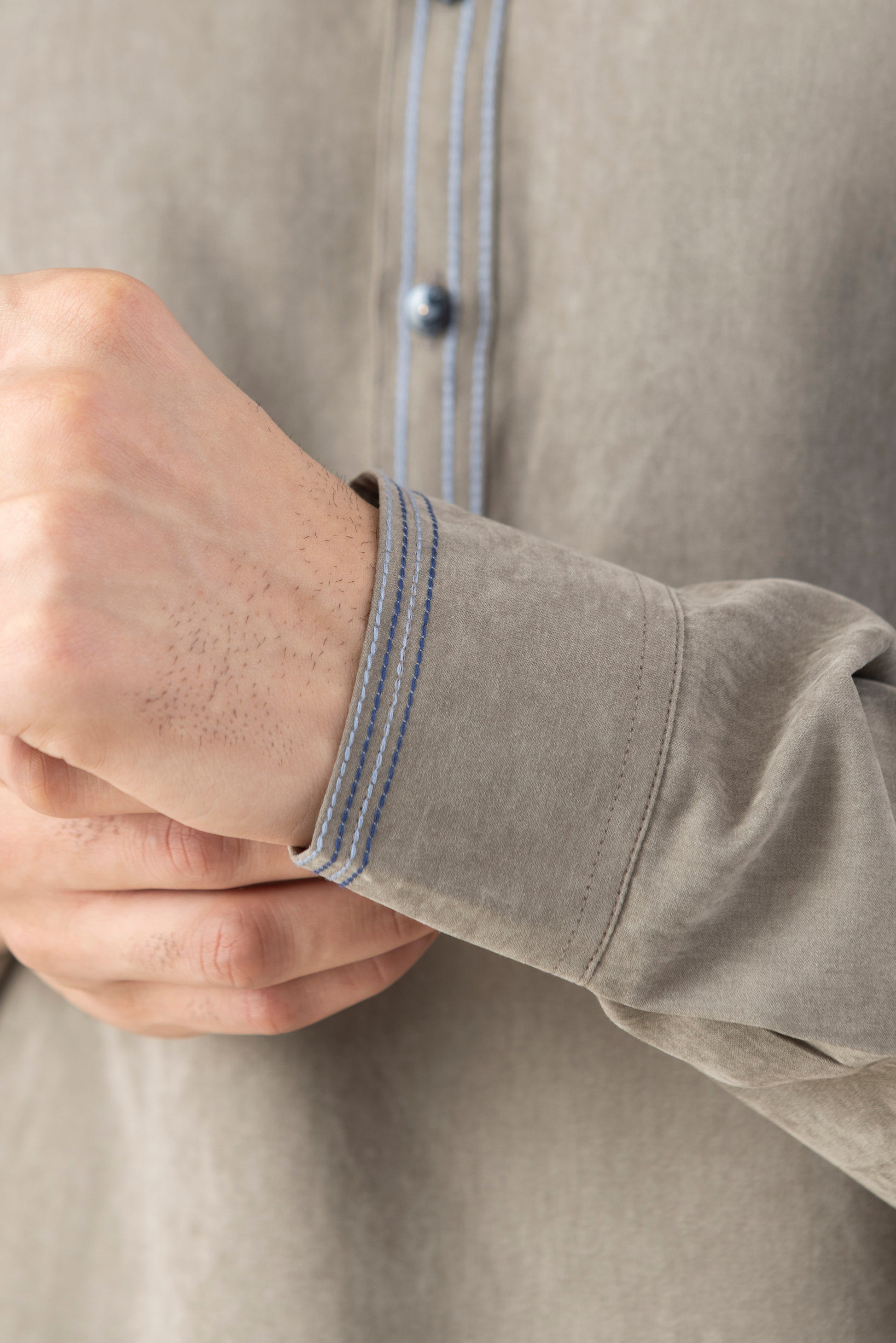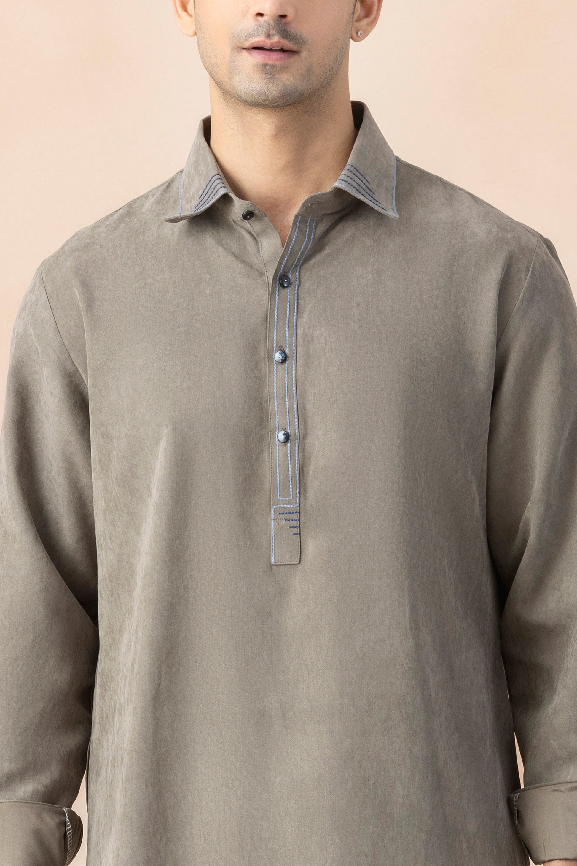 A refined men’s pathani crafted in a soft, washed grey fabric that offers a smooth yet slightly matte finish. The silhouette is clean and straight, designed for comfort while maintaining a structured, contemporary look. Minimal contrast stitching along the collar, placket, and neckline adds understated character without overpowering the design. Finished with a classic shirt-style collar and a streamlined button placket, this pathani balances traditional roots with modern elegance. Ideal for casual festive gatherings, cultural events, evening wear, and understated traditional occasions where effortless sophistication is key.
