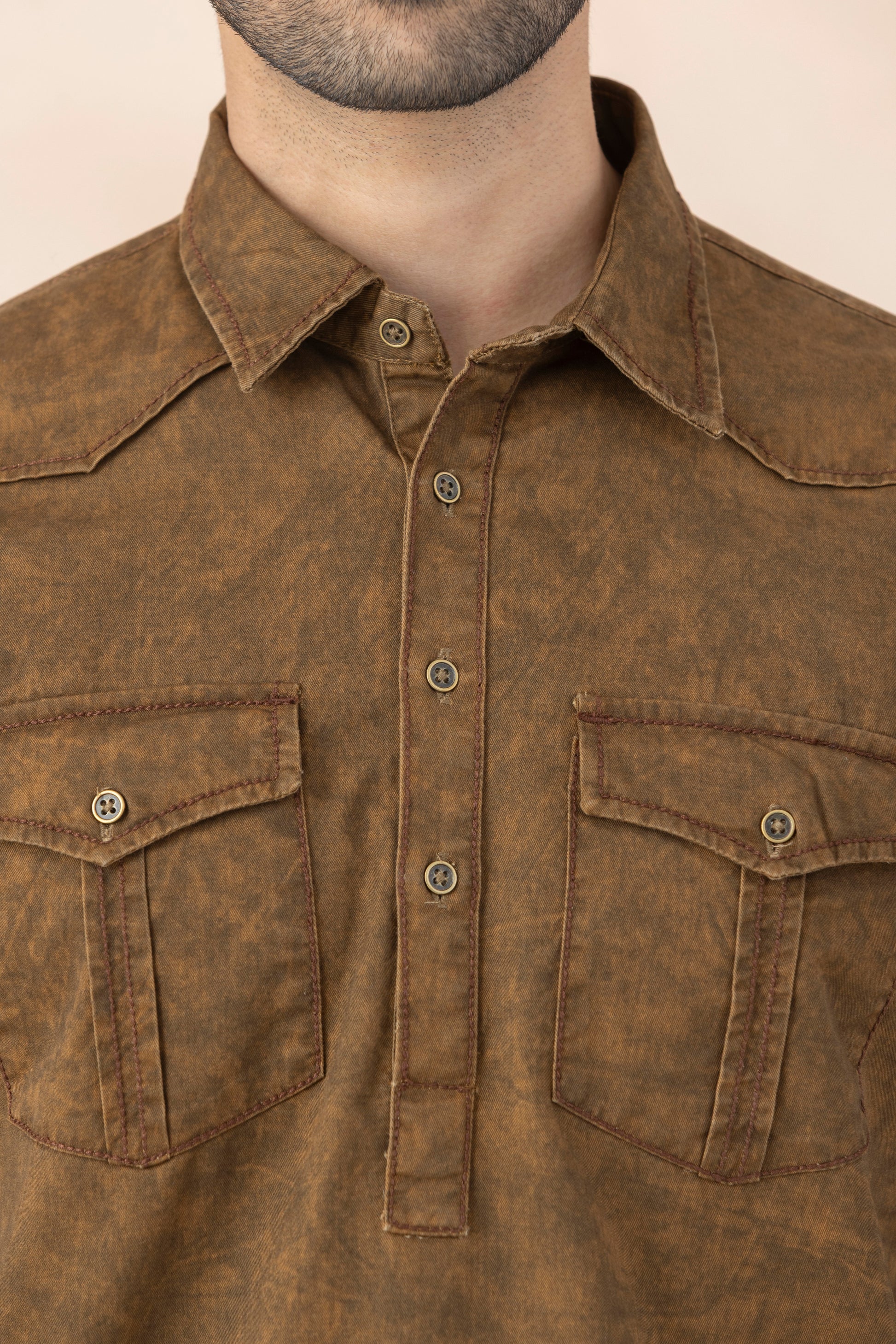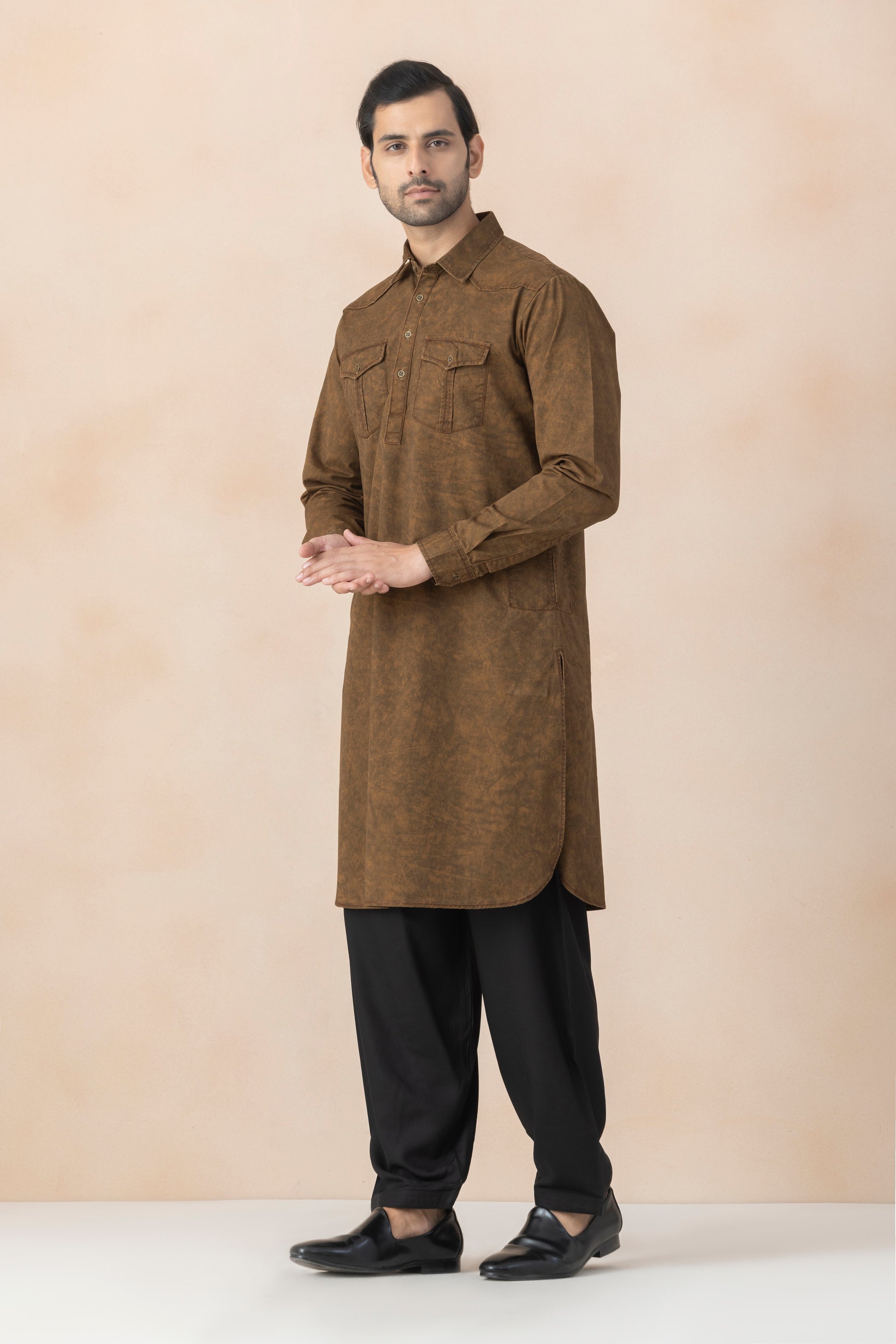 Crafted from cloud-washed denim, this Men’s Pathani Set combines traditional design with modern sensibilities. The pathani is detailed with Placket, button, or topstiches and structured in a straight fit with round hem, paired with matching bottoms.