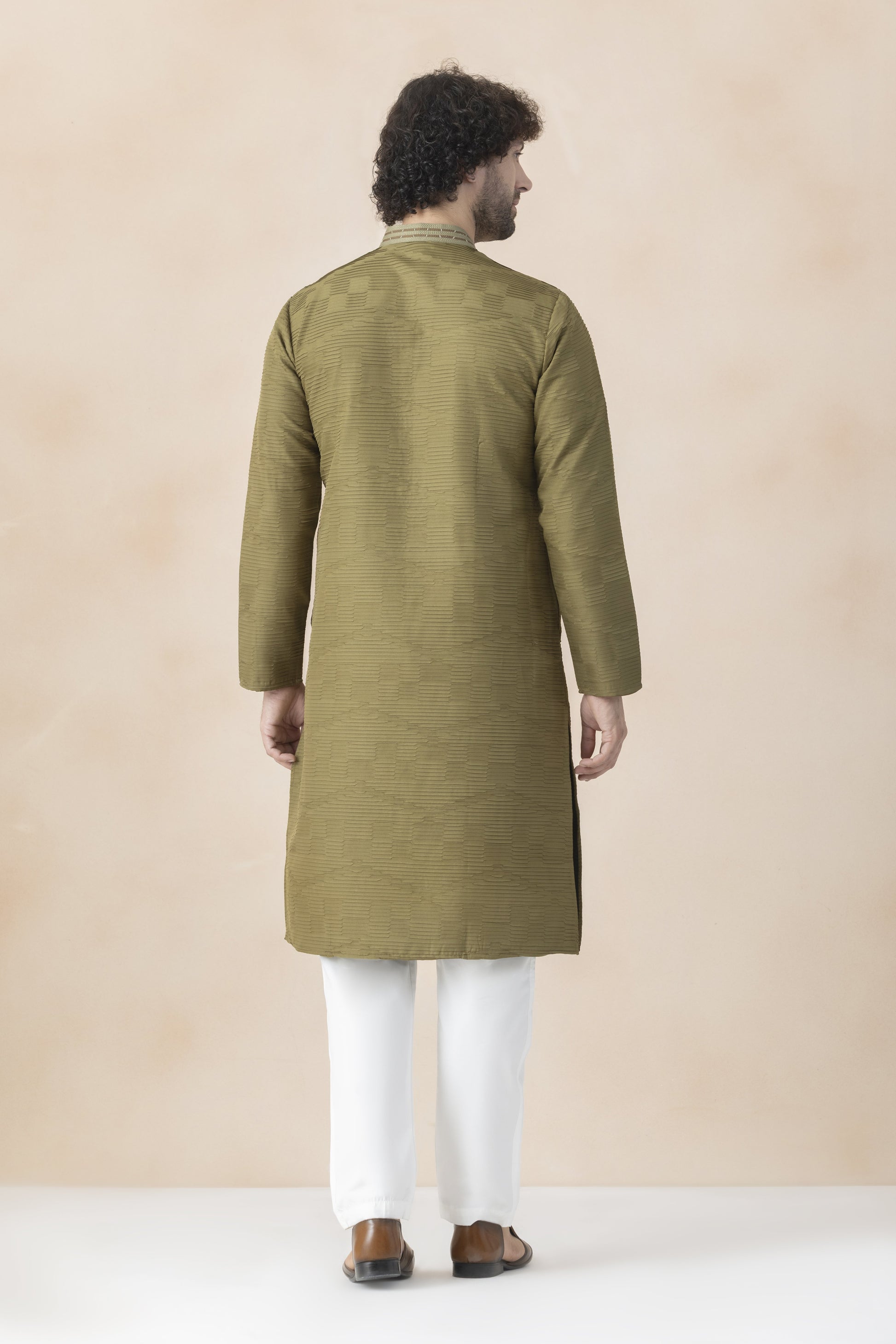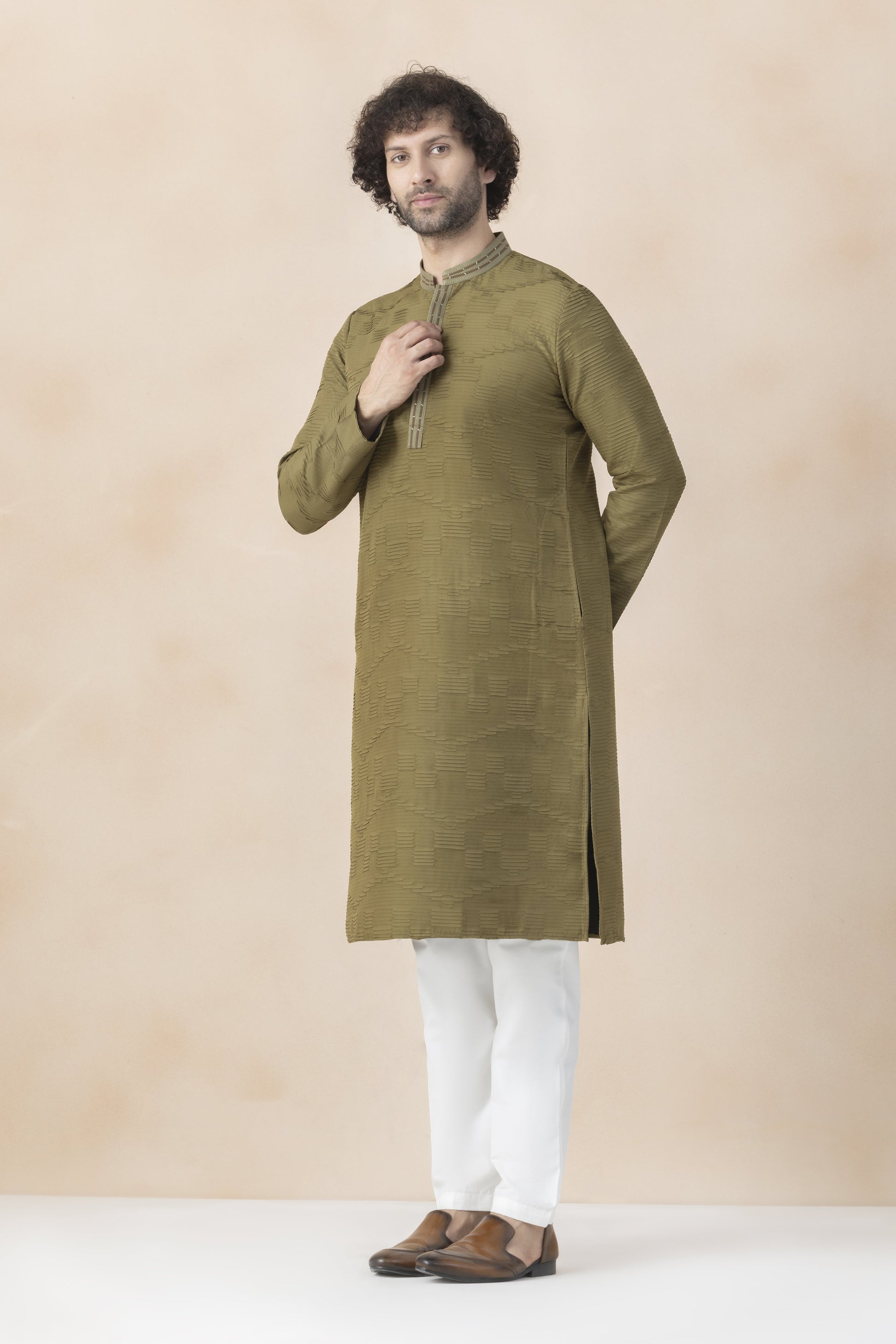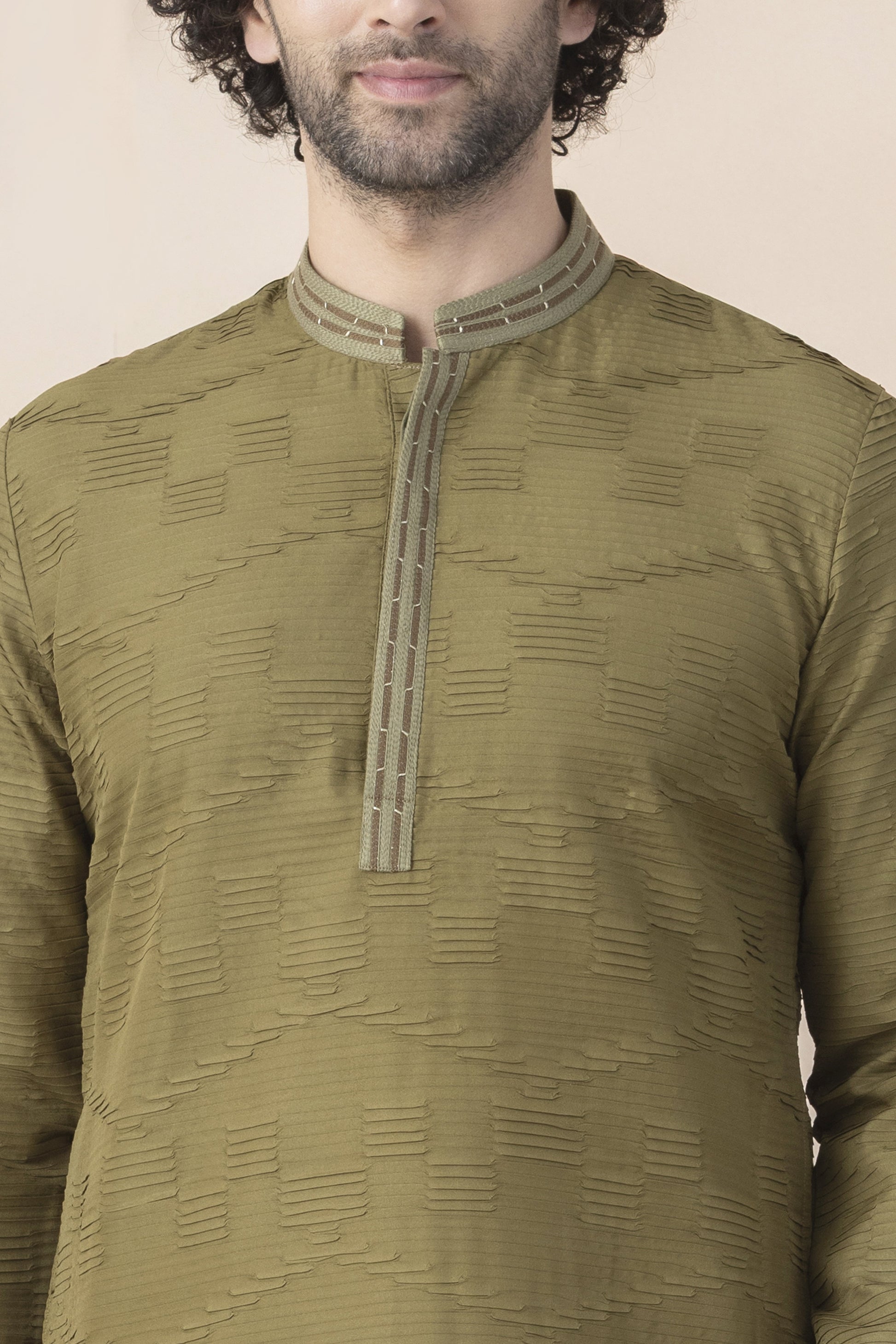 A men’s kurta tailored in a muted olive-green fabric, designed with a mandarin collar and a straight, contemporary silhouette. The finely executed pintuck pleats add depth and elegance to the garment, while the minimal embroidered placket lends a refined focal point. Balanced with full-length sleeves and a crisp finish, this kurta is ideal for festive gatherings, evening celebrations, cultural events, and sophisticated traditional occasions, offering a timeless yet modern appeal.