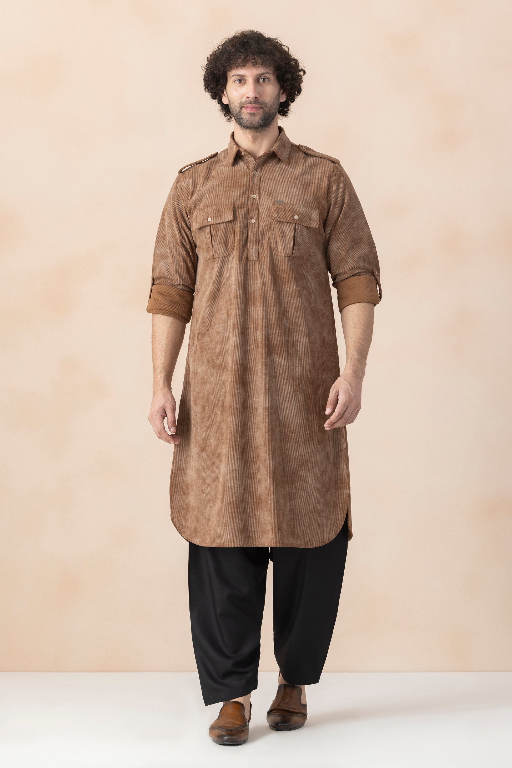This Men’s Pathani Set is made from corduroy, offering durability and comfort throughout the day. The pathani detailed with flap pocket, button, or topstiches and structured in a straight fit with round hem, paired with white bottoms.Designed for festive occasions, cultural gatherings, and traditional wear, this Pathani set reflects timeless ethnic style with a refined finish. Best styled with traditional footwear for an authentic look.